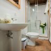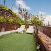 The layout is on two floors: on the upper floor, there is one bedroom with a double bed, and on the lower floor, there is one single bedroom, a bathroom, and a fully equipped kitchen. Outside, there is a small garden with a barbecue and a solarium with sun loungers.